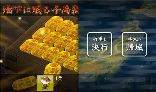If you wish to rush this map, having Ootachis with you or Iwatooshi can help you. Having gold troops (with musketeers, archers, and catapults) is a plus. For those who want to get a higher chance in walking to the resource nodes, be sure to have Tantous on your team. I had Gokotai and Hakata Toushirou on my team so I had a good haul of koban and resources as I went on.